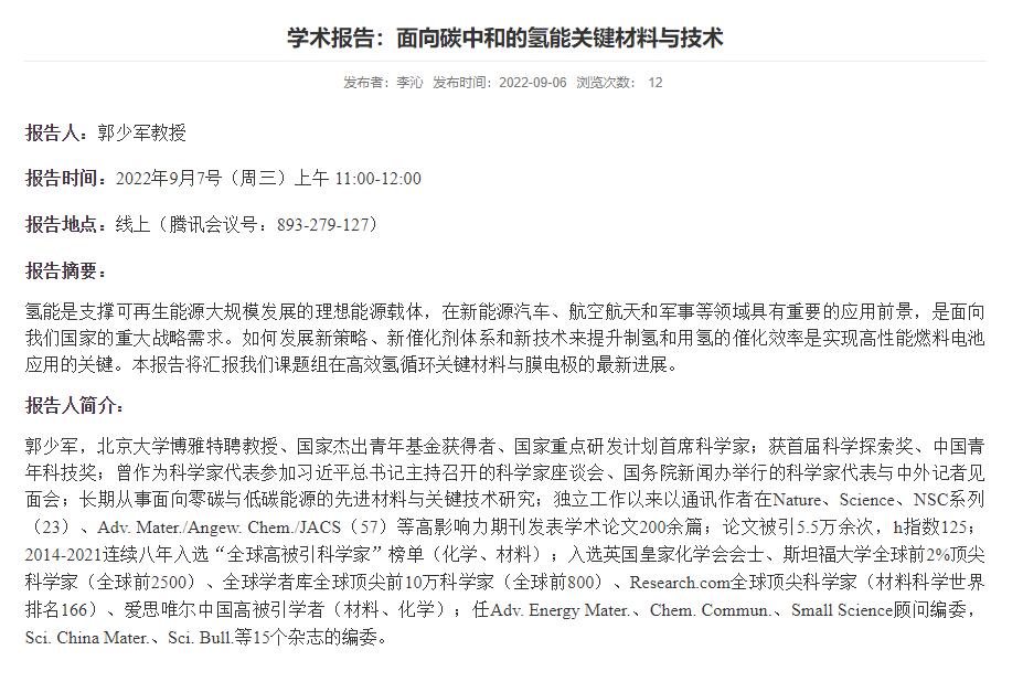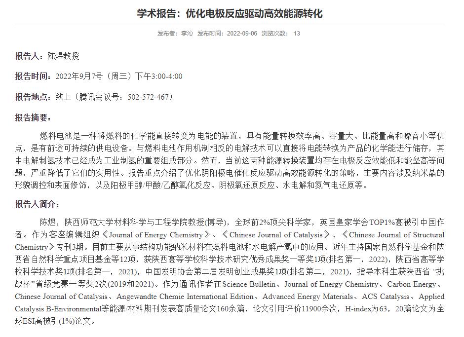 2022年9月7号邀请了郭少军教授、陈煜教授线上给能源学院的学生们作报告。